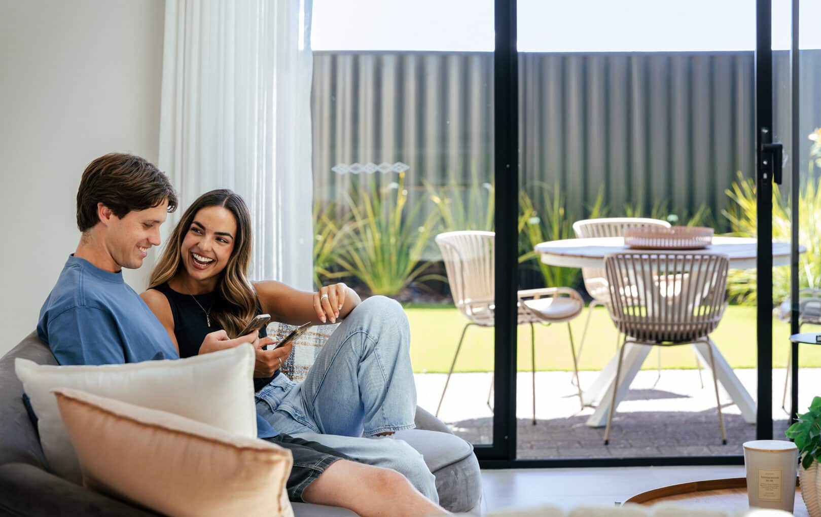 First home buyer couple sit together on the couch with their phones out. The home design shows an open plan living area that opens up to the outdoor alfresco area with large glass panel doors. The background shows a sunny day with a shaded outdoor dining area, and lush green lawn and green landscaping.